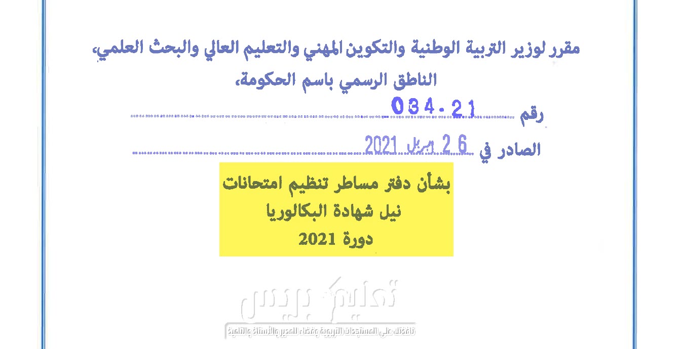 دفتر مساطر تنظيم امتحانات نيل شهادة البكالوريا دورة 2021 دفتر مساطر تنظيم امتحانات نيل شهادة البكالوريا دورة 2021 مقرر لوزير التربية الوطنية رقم 034-21 بتاريخ 26 أبريل 2021 بشأن دفتر مساطر تنظيم امتحانات نيل شهادة البكالوريا دورة 2021 تحميل المقرر مقرر لوزير التربية الوطنية رقم 034-21 بتاريخ 26 أبريل 2021 بشأن دفتر مساطر تنظيم امتحانات نيل شهادة البكالوريا دورة 2021 نقترح عليك تجربة هذه التطبيقات المفيدة: تحميل تطبيق منصة التعليم عن بعد moutamadris تحميل تطبيق مسار متمدرس تعلم الانجليزية بسهولة منصة التلميذ 2023 إليك أهم المواضيع المشابهة:امتحان وطني تجريبي في مادة الرياضيات علوم اقتصاد والتدبير...الرياضيات: الثانية باك علوم رياضيةديداكتيك الدعم في مادة التربية الاسلاميةالامتحان الوطني للرياضيات 2017 مع التصحيح الدورة العادية موقع المفيد التربوي المفيد رفيقكم نحو النجاح، ستجدون جميع الدروس لجميع المستويات والمسالك بالإضافة الى نماذج الفروض والامتحانات المحلية والجهوية والوطنية ...