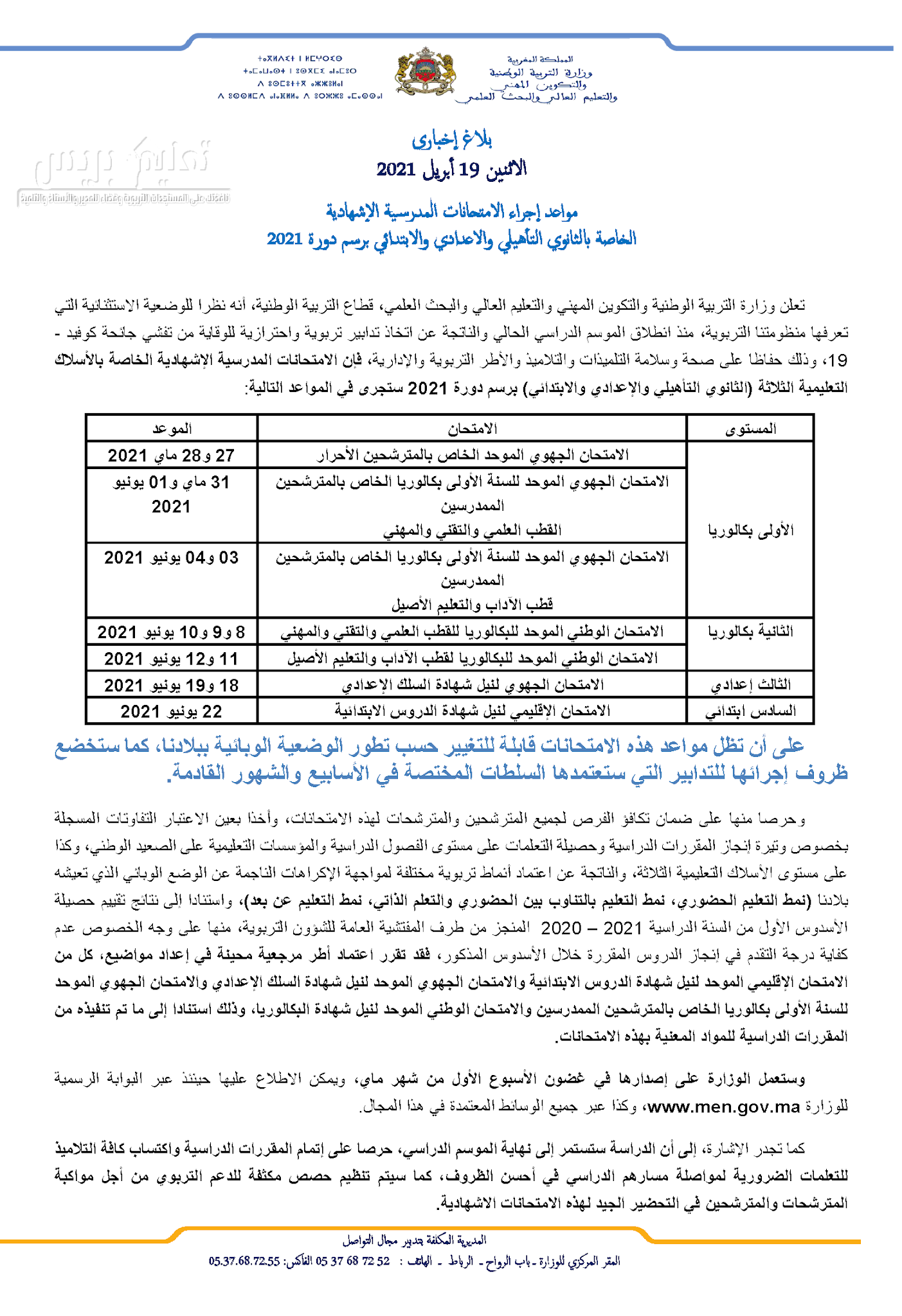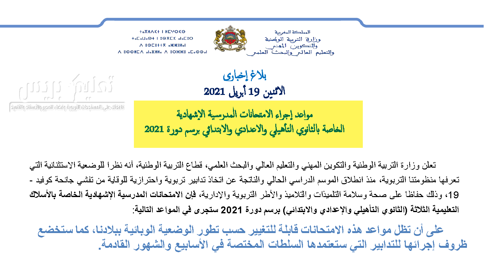 - -الأولى بكالوريا الامتحان الجهوي الموحد الخاص بالمترشحين الأحرار 27 و28 ماي 2021.