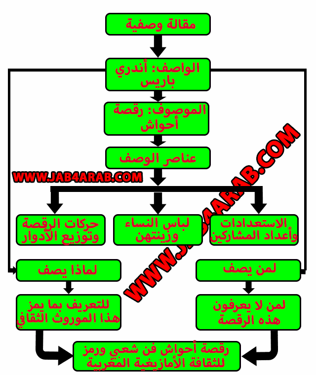 النص عبارة عن مقالة وصفية تصف رقصة من الفولكلور الشعبي الأمازيغي بالمغرب، وهي رقصة “أحواش” التي تقام في المناسبات والأعياد ويشترك في تأديتها الرجال والنساء.